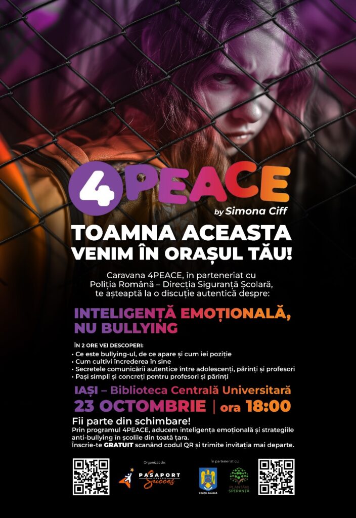 În perioada 13 octombrie – 6 noiembrie 2025, programul educațional Pașaport pentru Succes lansează turul național „4PEACE – Inteligența emoțională în școli, nu bullying”, o serie de 8 evenimente gratuite dedicate profesorilor, părinților, adolescenților și instituțiilor.