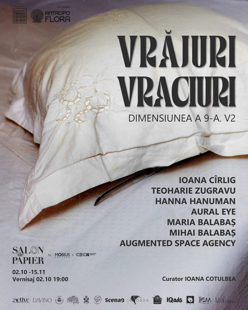 IOANA CÎRLIG: Fotografie la limita între documentar și ficțiune, fragmente din cercetarea de teren în satele din Dobrogea și Maramureș / TEOHARIE ZUGRAVU: Scenografie și instalație de obiecte constituind instrumentarul vrăjitoresc / HANNA HANUMAN: Ilustrații botanice de plante folosite în practici și ritualuri magice / Instalație VR, experiența imersivă a descântatului – AURAL EYE: Design Vizual, MARIA BALABAȘ și MIHAI BALABAȘ – Instalație sonoră, AUGMENTED SPACE AGENCY: Design experiențial, Developer / IOANA COTULBEA – Curator