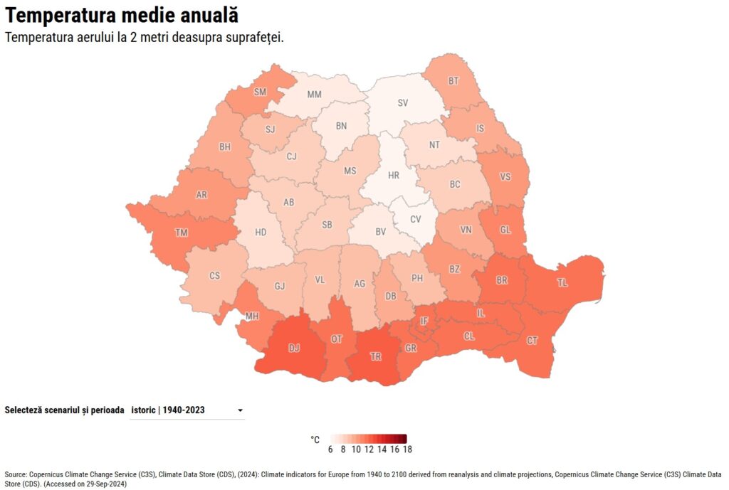 Harta (Fig.1) ne arată că cele mai afectate zone sunt cele din Sud-Estul și Sudul României. În perioada 1940-2023 județele Mehedinți, Olt, Giurgiu, Călărași, Teleorman, Ilfov (inclusiv București), Constanța, Tulcea temperatura medie anuală a aerului la 2 metri deasupra suprafeței este în creștere cu peste 10 °C iar posibilele scenarii pentru următoarele decenii sunt îngrijorătoare, mai ales datorită capacității agricole consistente ale acestor regiuni. Aridizarea, deșertificarea, stresul hidric, probleme cu care aceste județe deja se confruntă, ar putea deveni și mai persistente dacă măsuri adecvate de adaptare nu sunt implementate.
