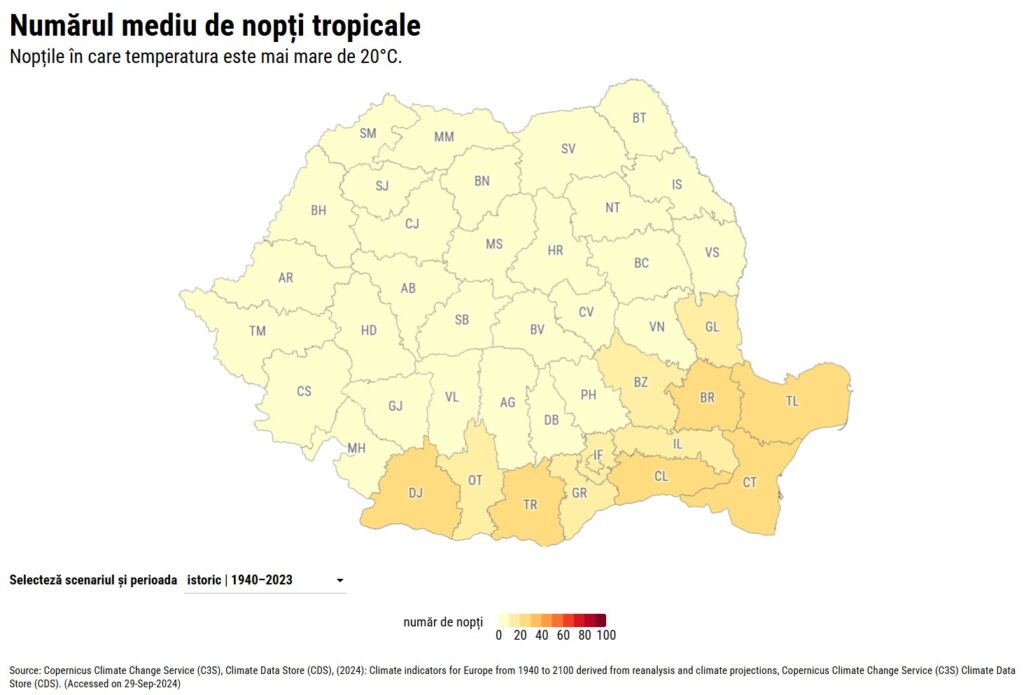 Din nou regiunile de Sud și Sud-Est sunt cele mai afectate aici. Județe montane precum Brașovul sau Harghita înregistrează încă un număr foarte scăzut de astfel de nopți pe timpul verii (sub 0.10). Însă județele Dolj, Teleorman, Călărași, Brăila, Tulcea și Constanța au anual peste 20 de nopți tropicale în care temperatura nu scade sub 20 de grade. Cu alte cuvinte, este atât de cald încât nici măcar noaptea nu aduce răcoare. Aceste nopți sunt un indicator al valurilor de căldură intense și prelungite și afectează somnul, sănătatea și confortul termic, mai ales în orașe, unde efectul de „insulă de căldură urbană” menține temperaturile ridicate și după apus.