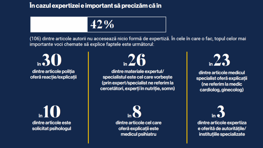 ● Aproape jumătate dintre articole nu accesează nicio formă de expertiză: în doar 10 dintre cele 365 de articole este solicitat psihologul, în 8 dintre articole medicul psihiatru și în 3 articole autoritățile/instituțiile specializate.
