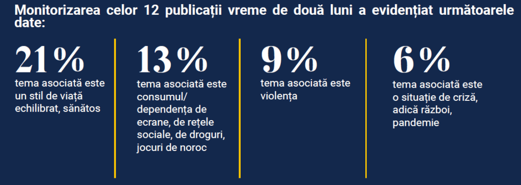 ● Presa scrie puțin despre sănătate mintală, preferând teme asociate: 21% dintre articole sunt despre un stil de viață echilibrat, sănătos; 13% sunt despre dependențe (de ecrane, rețele sociale, droguri, jocuri de noroc); 9% despre violență și 6% despre situații de criză (război, pandemie).