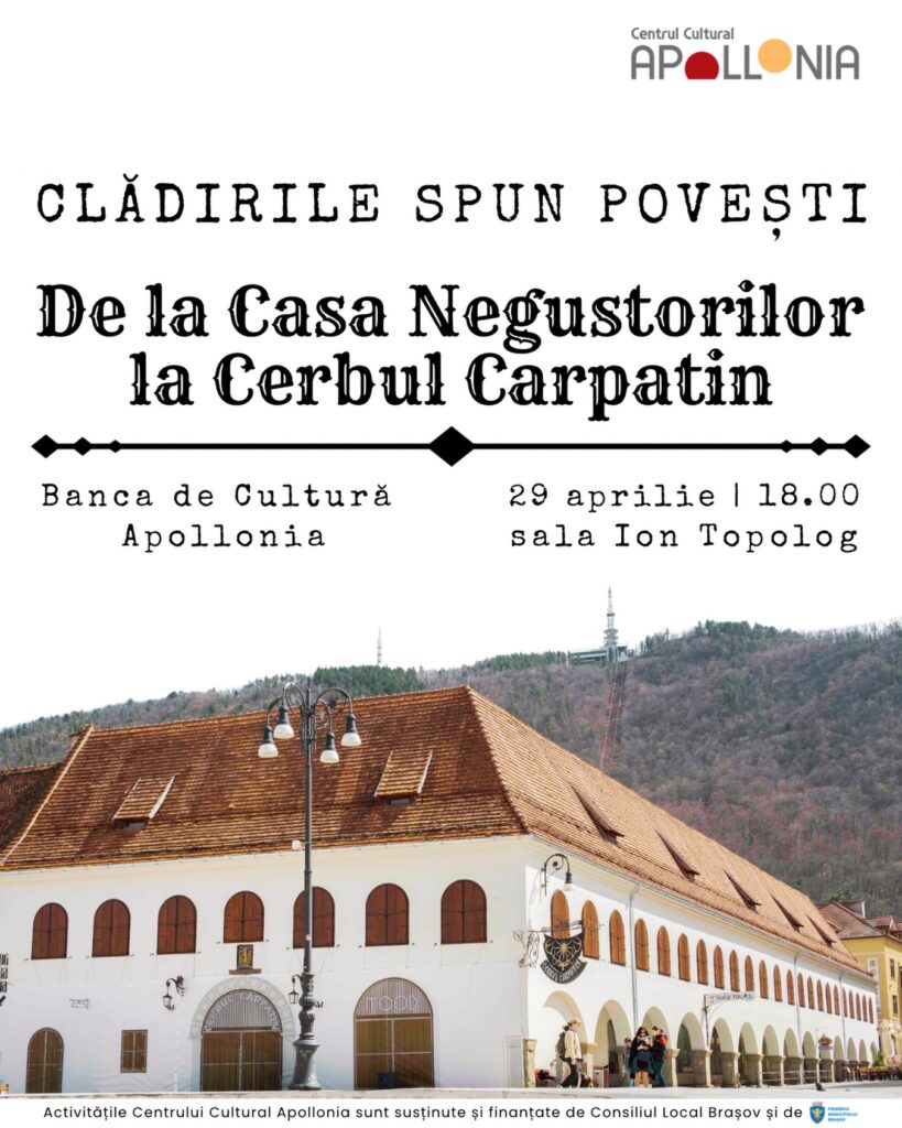 Centrul Cultural Apollonia vă invită în 29 aprilie 2026, ora 18.00, în sala „lon Topolog” (etajul I) la o întâlnire care abordează perspective arhitecturale și umane ale unei clădiri – simbol al comerțului și al prosperității Brașovului de-a lungul timpului.