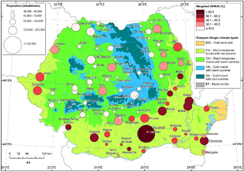 Gradul de expunere al populației la risc termic depinde de factori precum temperatura aerului și tipul de climat, ponderea zonelor construite și modul de utilizare a terenului, precum și densitatea populației. Cel puțin 40–50% dintre locuitorii orașelor cu peste 30.000 de locuitori trăiesc astăzi în zone cu risc termic ridicat sau foarte ridicat, iar în multe dintre localitățile din sudul țării, precum București, Craiova sau Galați, procentul depășește 50% (figura 2).