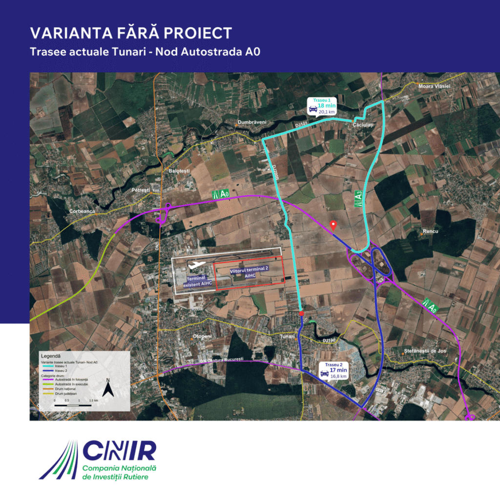 „Această conexiune de 2,5 kilometri va reduce la doar două minute, un drum care, pe rețeaua existentă necesită aproape 20 de minute pentru a parcurge o distanță de 16-20 kilometri. Realizarea conexiunii rutiere va deservi în primă fază comunitățile din zona localității Tunari, dar este imperativă pentru construirea Terminalului 2 al celui mai important aeroport din România. Nu în ultimul rând va facilita transportul mărfurilor pentru zona Cargo a Aeroportului Otopeni”, a precizat Directorul General al Companiei Naționale de Investiții Rutiere, Gabriel Budescu.