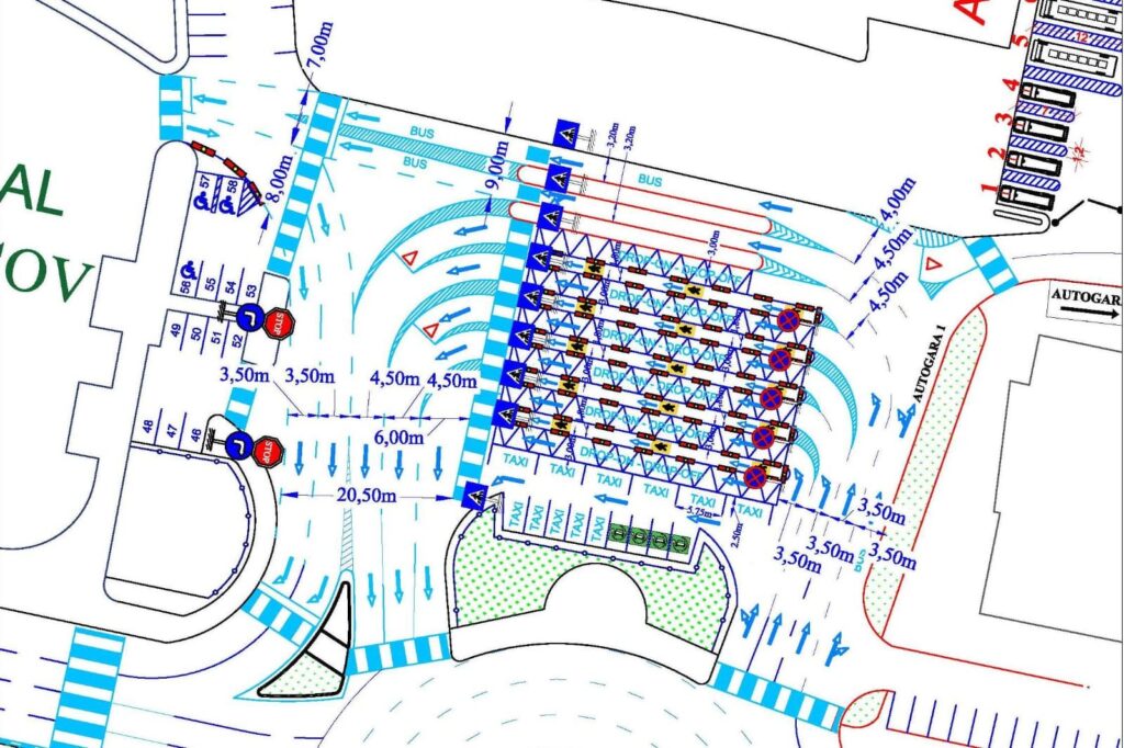 Din planșa pusă la dispoziție de Primăria Brașov vedem că locurile de parcare vor fi desființate și se vor face cinci culoare pentru îmbarcare debarcare. Un alt element este acela că trecerea de pietoni rămâne făcută doar în capătul culoarelor dinspre Terminalul RATBV, cu extindere până la stația de taxi nou amenajată lângă monument.