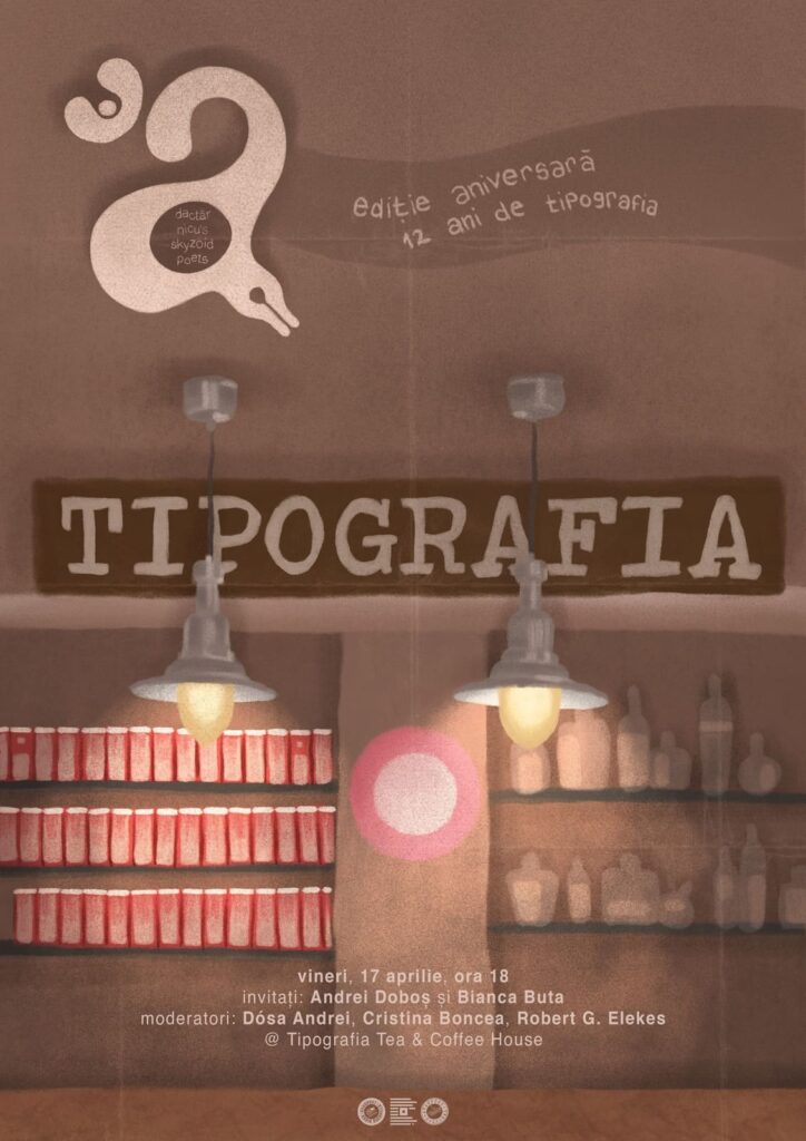 Dactăr Nicu’s Skyzoid Poets revine cu serile de lecturi după o mică pauză. Tipografia împlinește 12 ani vineri, 17 aprilie, iar de la ora 18:00 vă puteți întâlni cu două lecturi de poezie, cea a lui Andrei Doboș, care a publicat anul trecut excelentul său volum „Panou” la editura Art și cea a Biancăi Buta, absolventă a Facultății de Litere și a masteratului de Inovare Culturală din cadrul Universității Transilvania.