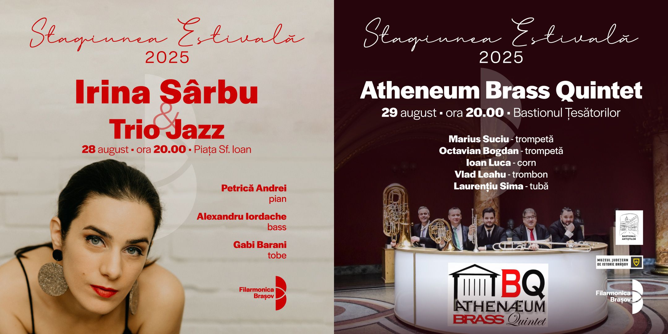 Vineri, 29 august, tot de la ora 20.00, Bastionul Țesătorilor se va deschide pentru sonoritățile impunătoare ale ansamblului Atheneum Brass Quintet. Cu rafinamentul lor muzical și energia specifică instrumentelor de alamă, cei cinci muzicieni vor aduce în spațiul medieval un repertoriu variat, de la lucrări clasice la aranjamente moderne, într-o seară în care măreția și emoția vor merge mână în mână.