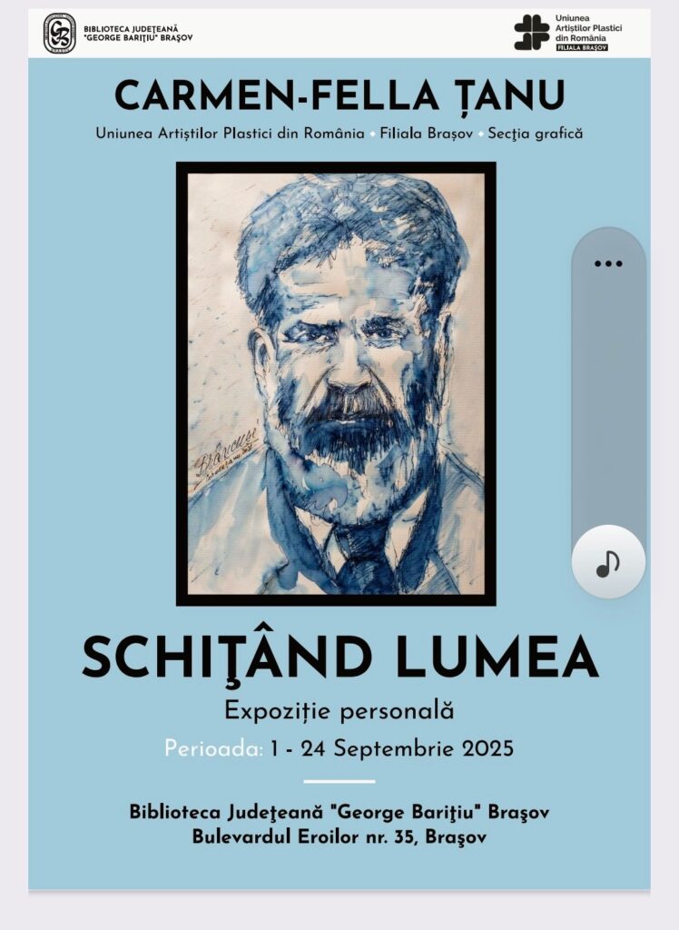 Artista Carmen-Fella Țanu membră a Uniunii Artiștilor Plastici din România, Filiala Brașov, Secția Grafică expune pe simezele Galeriei de pe scară lucrările personale reunite sub tiltlul „Schițând Lumea”.