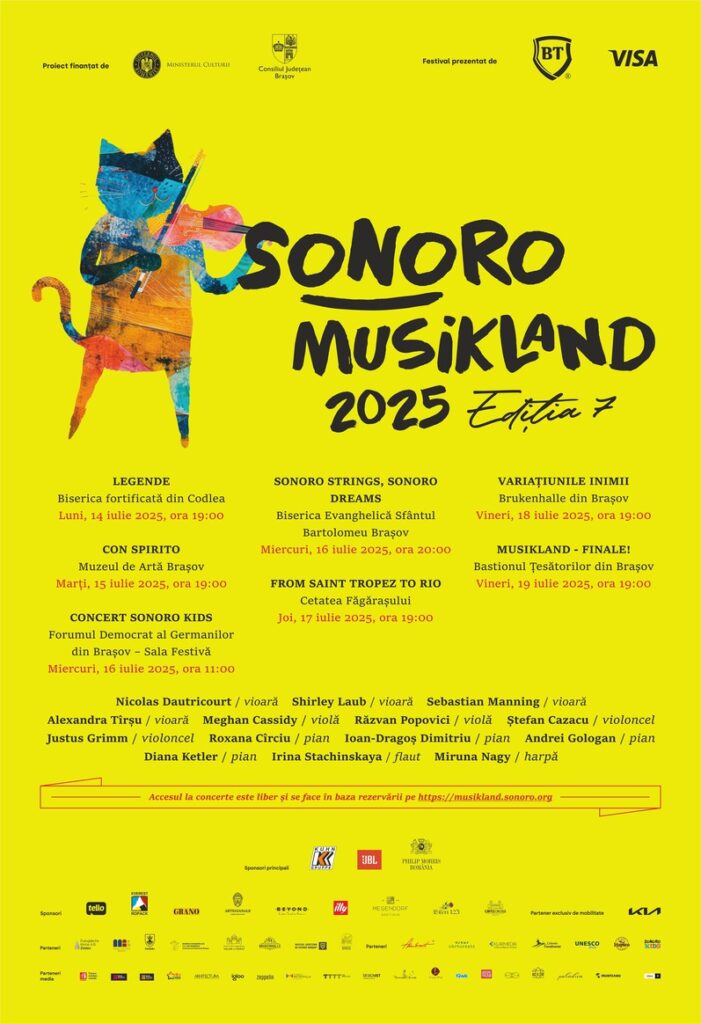 SoNoRo Musikland, festivalul dedicat tradițiilor și patrimoniului orașului Brașov și al câtorva sate de pe Colinele Transilvaniei, se va desfășura în perioada 4-19 iulie 2025 și va include în acest an și orașul Sibiu. 15 concerte – dintre care două jamsessions și trei concerte SoNoRo Kids, în perioada 9-19 iulie a.c. – vor pune în valoare capitalul cultural din județul Brașov, prin intermediul muzicii de cameră, la apus de soare și lumina lunii. Accesul la toate concertele ediției a VII-a este liber, în baza unei rezervări pe site-ul festivalului.