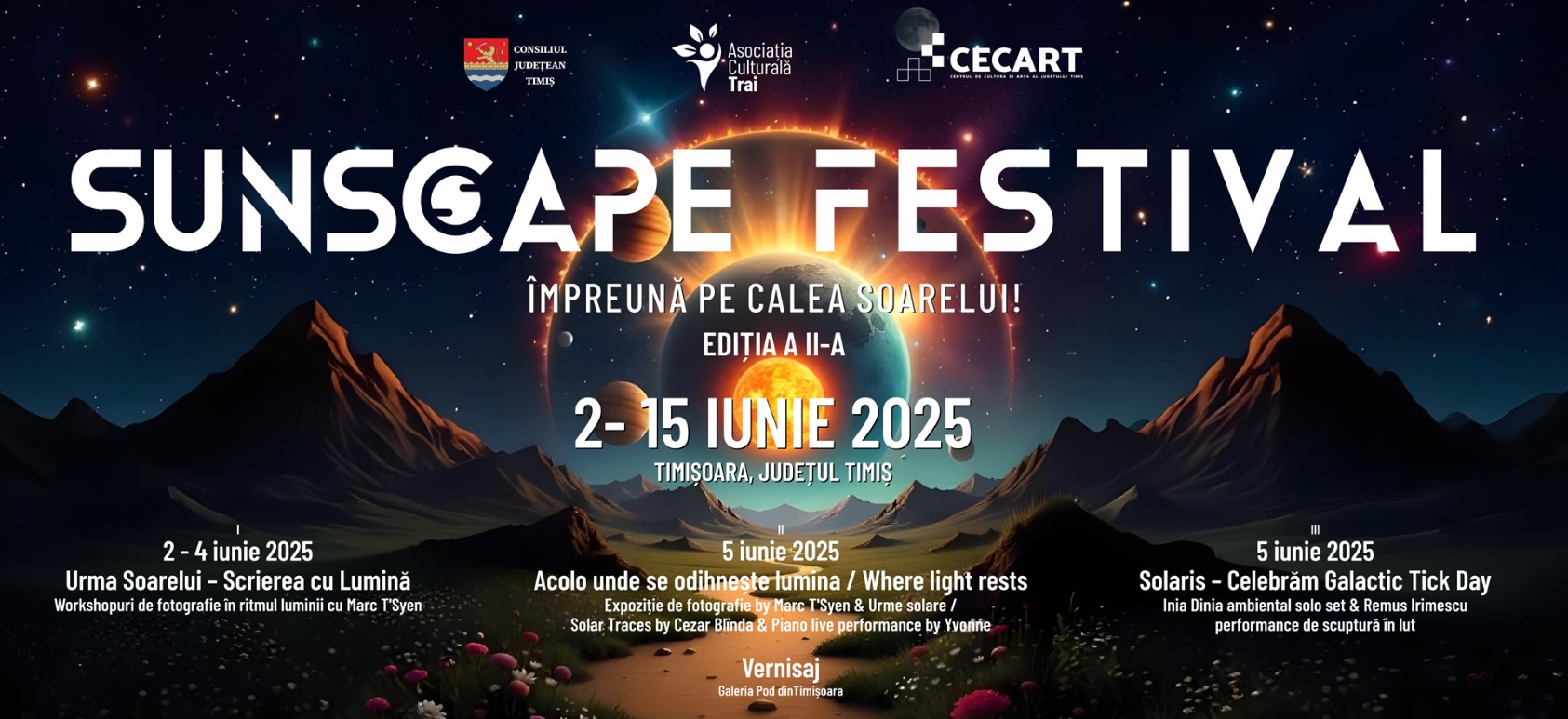 În perioada 2 – 15 iunie, cetatea Timișoarei va fi din nou atinsă de aripa luminii – festivalul Sunscape revine cu cea de-a doua ediție, un eveniment care îmbină arta, educația și vibrația cosmică într-o celebrare multisenzorială a soarelui și a expresiei umane.