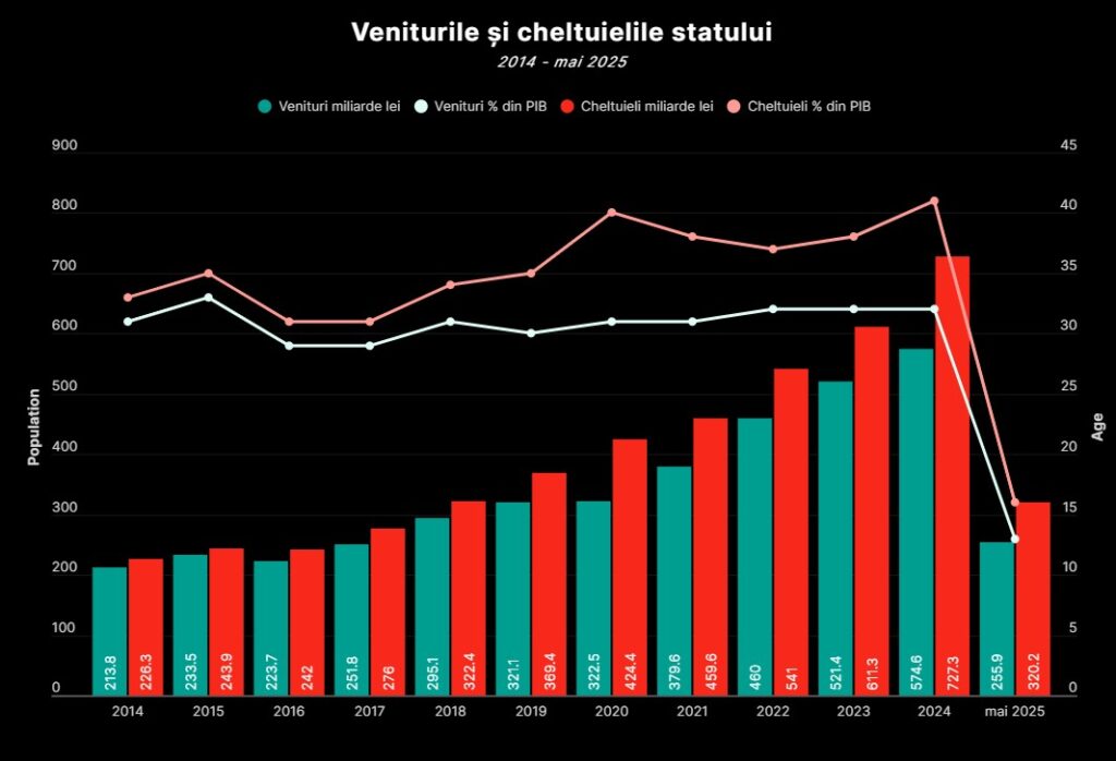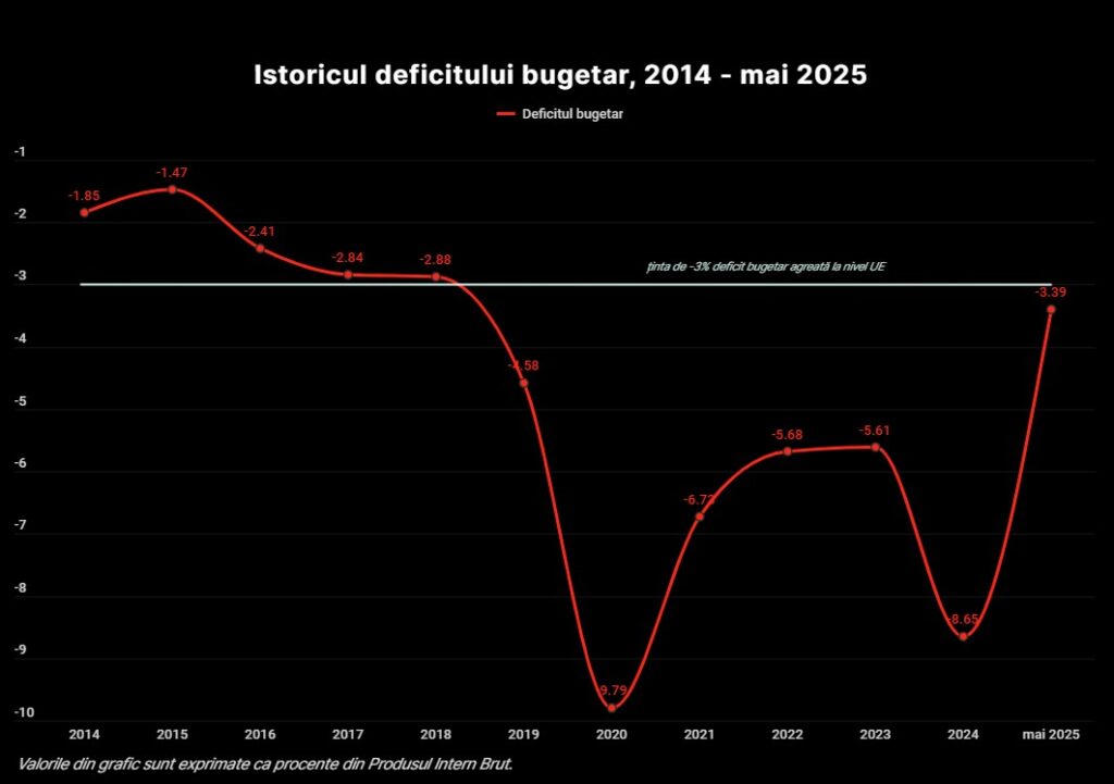 Deficitul bugetar de la finalul lunii mai a acestui an (cele mai recente date) se ridica la –3,39% din PIB, apropiindu-se periculos de mult de valoarea deficitului bugetar înregistrat în aceeași perioadă a anului trecut (-3,41% din PIB). Deși veniturile se află în creștere cu 13,6% față de mai 2024, acestea nu țin pasul cu nivelul de cheltuire a banilor publici, care a crescut cu 12,2%. România plătește cu aproape 43% mai mult pentru dobânzi față de aceeași perioadă a anului trecut, iar perspectivele economice și fiscal-bugetare depind de implementarea unor măsuri austere, care vor aduce scumpiri, dar și scăderi de venituri pentru români.