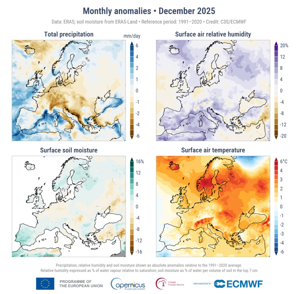 Datele ERA5 (pe care se bazează raportul Copernicus) indică o temperatură medie globală de 13,15°C pentru decembrie 2025, cu 0,49°C peste media perioadei de referință 1991–2020. La nivel european, luna s-a clasat ca a patra cea mai caldă lună decembrie (la egalitate cu decembrie 2011), cu o diferență de +1,99°C față de medie. Cele mai pronunțate anomalii pozitive au fost înregistrate în Norvegia, Suedia și în Islanda, unde ziua de Ajun temperatura înregistrată la o stație meteorologică din estul insulei a fost de 19,8°C, stabilind un record absolut pentru această dată. Temperatura medie a suprafeței oceanelor (60°S–60°N) a fost de 20,5°C, a patra cea mai ridicată valoare înregistrată vreodată pentru luna decembrie.