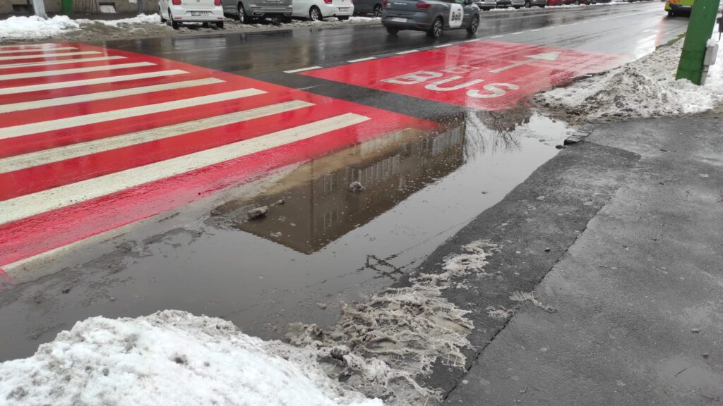 Un element recurent care arată cât de deficitar este realizată infrastructura stradală ține de trecerile de pietoni, unde băltește apa, nu doar iarna. Dar vă las un exemplu al acestor zile.