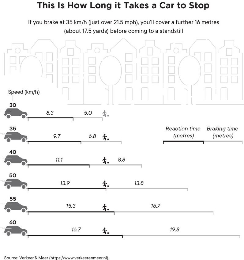 Dacă un biciclist este lovit de o mașină la 50 km/h, are doar 10% șanse de supraviețuire, dar la 30 km/h, aceasta crește la aproximativ 90%.