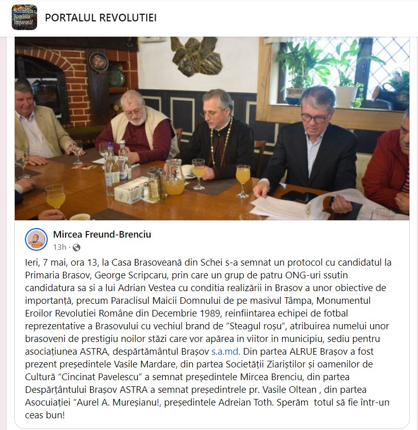 Primul exemplu este din campania de la alegerile locale din 2024, când unul dintre conservatorii Brașovului, Mircea Freund-Brenciu anunța pe Facebook susținerea pentru George Scripcaru: „leri, 7 mai, ora 13, la Casa Brasoveană din Schei s-a semnat un protocol cu candidatul la Primaria Brasov, George Scripcaru, prin care un grup de patru ONG-uri sustin candidatura sa si a lui Adrian Vestea cu conditia realizării in Brasov a unor obiective de importanță, precum Paraclisul Maicii Domnului de pe masivul Tâmpa, Monumentul Eroilor Revolutiei Române din Decembrie 1989, reinfiintarea echipei de fotbal reprezentative a Brasovului cu vechiul brand de „Steagul roşu”, atribuirea numelui unor brasoveni de prestigiu noilor stăzi care vor apărea in viitor in municipiu, sediu pentru asociațiunea ASTRA, despărtământul Braşov s.a.md. Din partea ALRUE Braşov a fost prezent preşedintele Vasile Mardare, din partea Societății Ziariștilor şi oamenilor de Cultură “Cincinat Pavelescu” a semnat preşedintele Mircea Brenciu, din partea Despărţământului Braşov ASTRA a semnat preşedintrele pr. Vasile Oltean, din partea Asociaţiei “Aurel A. Mureșianu”, preşedintele Adreian Toth. Sperăm totul să fie într-un ceas bun!”.