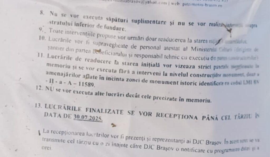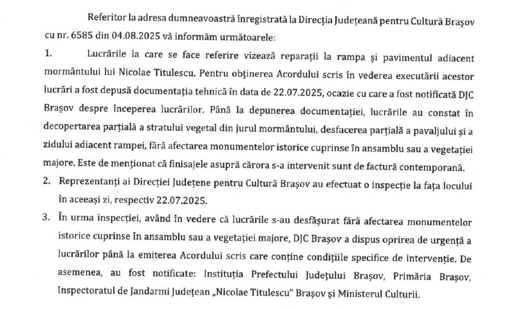 Ce observăm citind al doilea răspuns și acordul scris? Vedem că DJC Brașov știa de lucrările neavizate și că a dispus oprirea de urgență a acestora până la emiterea acordului, dar și că a informat alte instituții: Prefectura Brașov, Primăria Brașov, Inspectoratul de Jandarmi Județean „Nicolae Titulesc” Brașov și Ministerul Culturii.