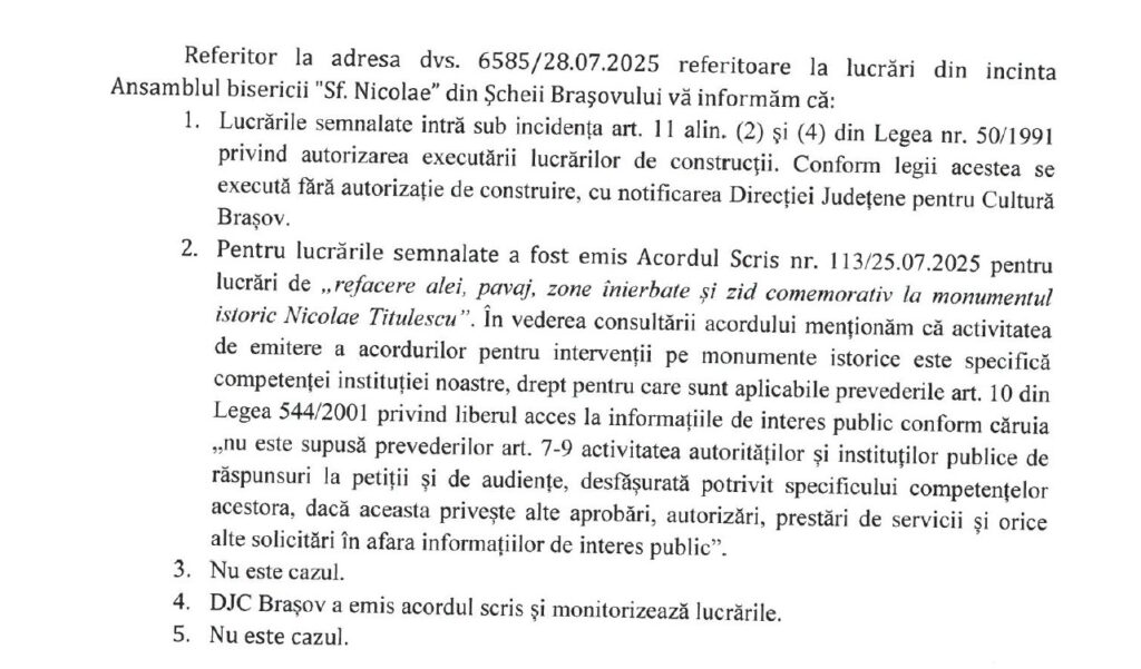 Primul răspuns este unul evident de acoperire a faptului că au avut loc lucrări neavizate. Și iată ce răspunde DJC Brașov: că pentru lucrările semnalate a fost emis Acord scris nr. 113 din 25.07.2025 și au refuzat să trimită o copie invocând că acest document nu ar fi informație publică și că nu s-ar supune prevederilor legii 544/2001. Mai mult, în răspunsul la solicitare, DJC Brașov lasă să se înțeleagă că nu sunt probleme, că nu au trebuit luate măsuri și că nu au sesizat alte instituții.