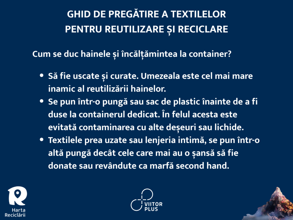 „Primii pași în gestionarea deșeurilor textile au fost făcuți, însă este doar începutul. Un sistem complet funcțional are nevoie de sprijinul tuturor actorilor implicați – consumatori, producători, comercianți de textile, firme de colectare, sortare și reciclare, autorități locale, legiuitori. Dacă vrem să reducem cu adevărat «Muntele de Haine», trebuie să ne implicăm cu toții să dezvoltăm întregul lanț, de la prevenire și reutilizare până la reciclare”, spune Mihail Tănase, consultant comunicare, Harta Reciclării.