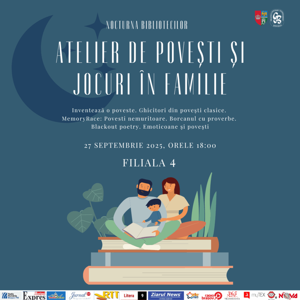 Sâmbătă, 27 septembrie 2025, începând de la orele 18,00, vă invităm la Nocturna Bibliotecilor la Braşov. Activităţile şi evenimentele se vor desfăşura în sediul central al bibliotecii şi în Casa Baiulescu, din Livada Poştei, precum şi la Filiala 3 ( Str. Soarelui nr. 6, parter) și Filiala 4 (strada Berzei nr 2, parter).