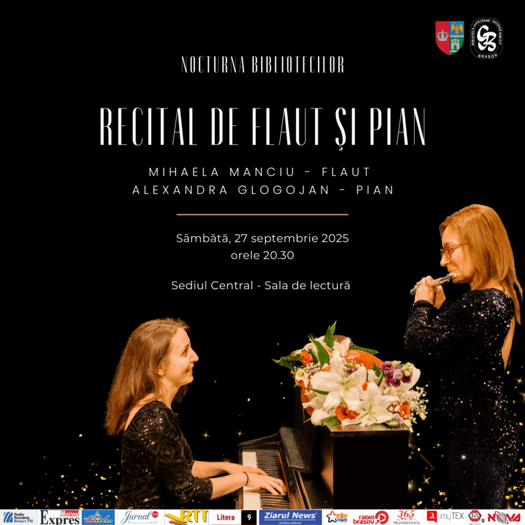 Începând cu 20,30 Sala de lectură devine scena unui recital extraordinar de flaut şi pian, susţinut de două muziciene de prestigiu: Mihaela Manciu (flaut) şi Alexandra Glogojan (pian). Distinse cu premii internaționale la categoria „profesioniști”, cele două îmbină cu succes activitatea concertistică și solistică cu cea pedagogică. Ele inspiră și formează noi generații de artiști la Liceul Vocațional de Muzică „Tudor Ciortea” din Brașov, unde elevii obțin, la rândul lor, premii la olimpiade și concursuri naționale și internaționale.