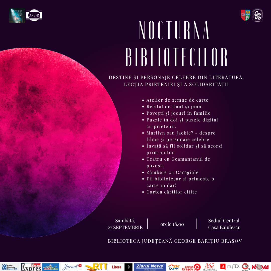 Biblioteca Judeţeană „George Bariţiu” Braşov participă la evenimentul cultural anual Nocturna Bibliotecilor 2025, organizat la nivel naţional de Asociația Națională a Bibliotecarilor și Bibliotecilor Publice din România (ANBPR), reunind biblioteci publice din România și Republica Moldova într-o celebrare comună a lecturii, prieteniei și incluziunii. Tema Nocturnei Bibliotecilor este „Destine și personaje celebre din literatură – lecția prieteniei și a solidarității”, ediția din 2025 invitând cititorii de toate vârstele să redescopere poveștile care ne unesc și să experimenteze momente de apropiere prin lecturile dedicate prieteniei, diversității și solidarității, inspirate din marile opere literare, activități intergeneraționale, în care părinți, bunici și nepoți citesc și petrec timp de calitate împreună, recomandări de lectură, schimb de sugestii menit să creeze punți între generații și comunități.