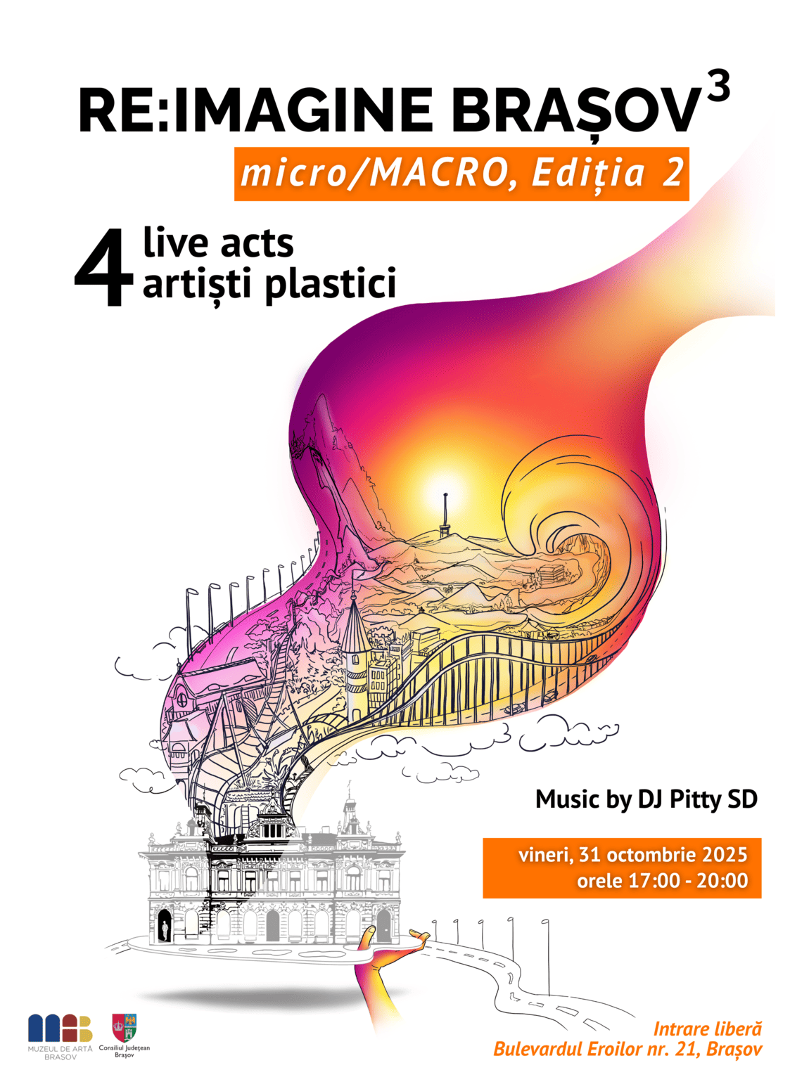 Muzeul de Artă Brașov vă invită vineri, 31 octombrie 2025, între orele 17:00 și 20:00, la un nou eveniment al proiectului „Re:Imagine Brașov – micro/MACRO”. Sub umbrela artelor vizuale și a muzicii, publicul, creatorii și profesioniștii din domeniul cultural se întâlnesc pentru discuții, schimb de idei și o seară de toamnă petrecută împreună în spațiul prietenos al muzeului.