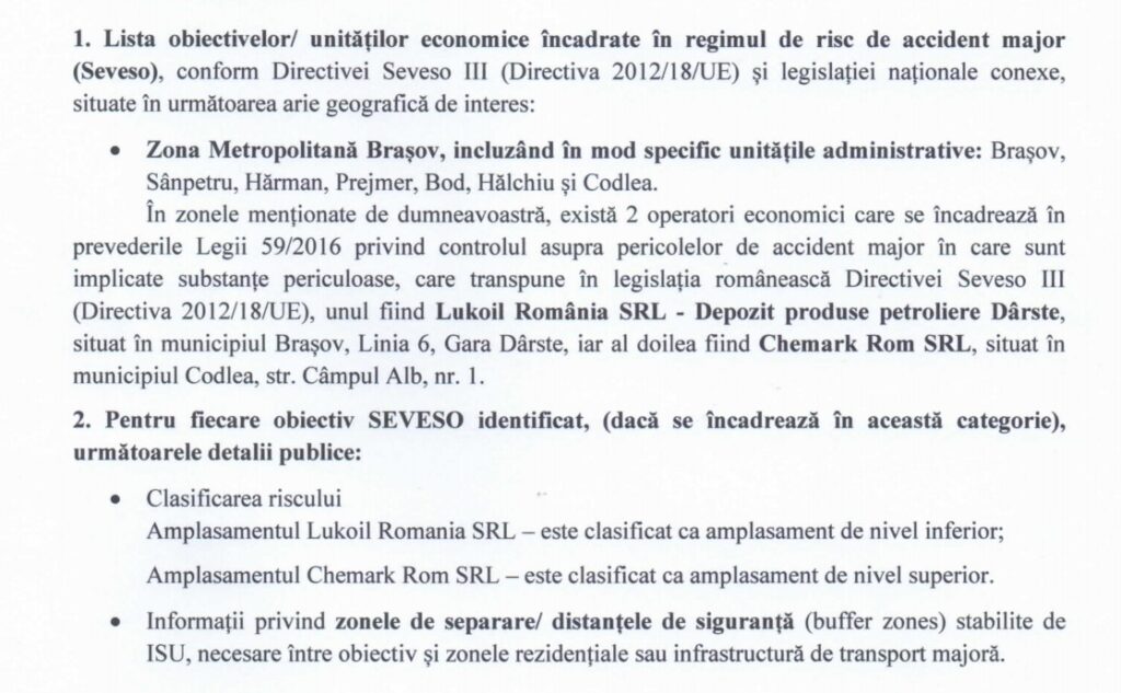 Informația din HG-ul respectiv se confirmă în urma unei solicitări de informații depuse de un locuitor din Sânpetru la ISU Brașov prin care a cerut lista obiectivelor/unităților economice încadrate în regimul de risc de accident major (SEVESO), conform Directivei Seveso III (Directiva 2012/18/UE) și legislației naționale conexe, situate în următoarea arie geografică de interes: Zona Metropolitană Brașov, incluzând în mod specific unitățile administrative: Brașov, Sânpetru, Hărman, Prejmer, Bod, Hălchiu și Codlea.