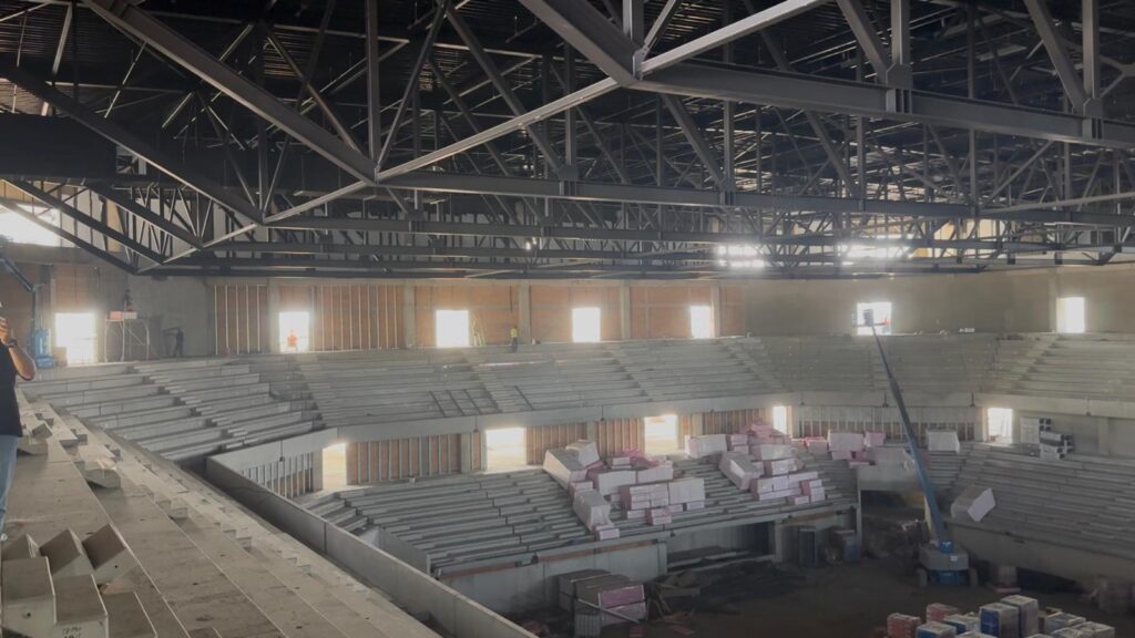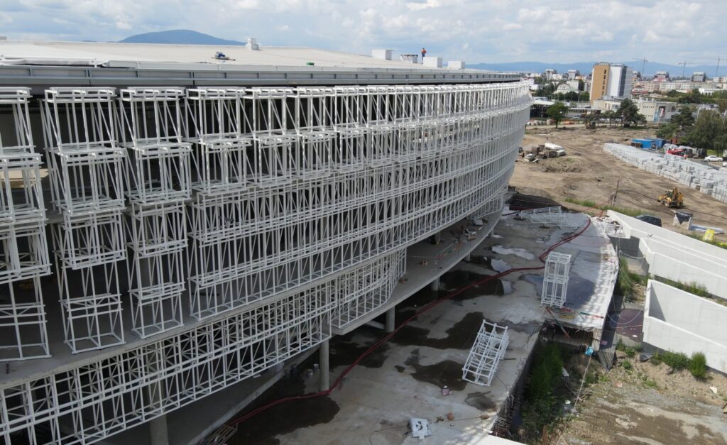 Până în prezent s-au finalizat lucrările de construire a structurii în proporție de 95%, cele la acoperișul sălii mari sunt realizate la aproximativ 96% din suprafață, și 95% la sala mică. Zidăriile au ajuns la 90% din lucrări, iar compartimentările la 40%. Acum se lucrează la instalațiile interioare, finalizate 30%, fațade, care au ajuns la un procent de realizare de 40%, și la celelalte lucrări exterioare, inclusiv umbrarele. Din totalul lucrărilor necesare pentru acest proiect constructorul a realizat 58%.