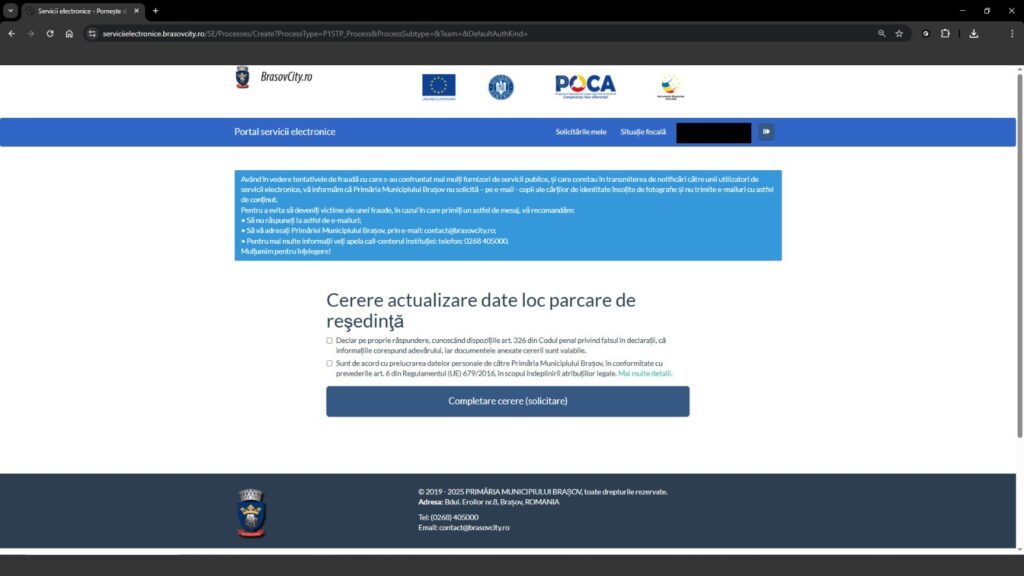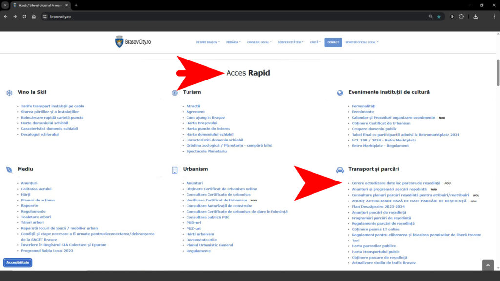 Din această săptămână, pentru a veni în sprijinul brașovenilor care vor să își revalideze locul de parcare sau vor să facă anumite modificări, portalul www.brasovcity.ro oferă un link către o platformă care oferă această posibilitate, direct de pe site. Link-ul „Cerere actualizare date loc parcare de reședință” se găsește în pagina principală a portalului, derulând în jos, la secțiunea „Acces Rapid” , capitolul „Transport și parcări” .