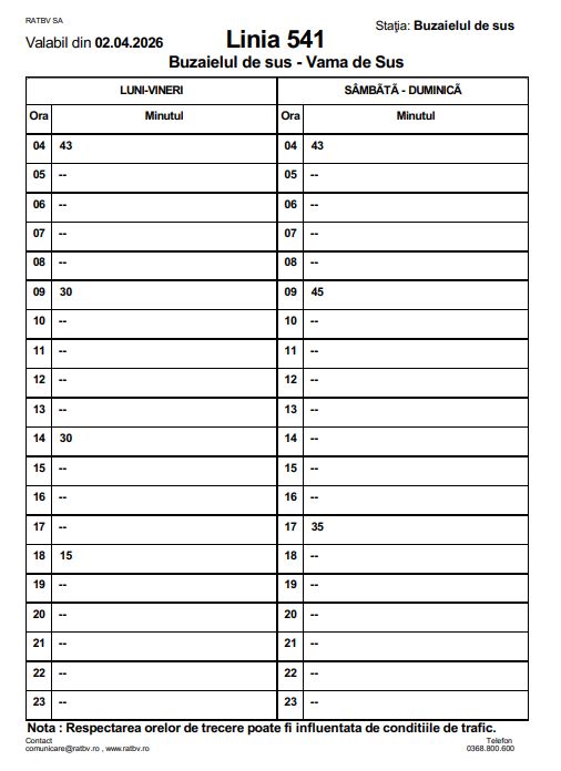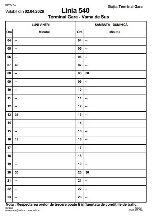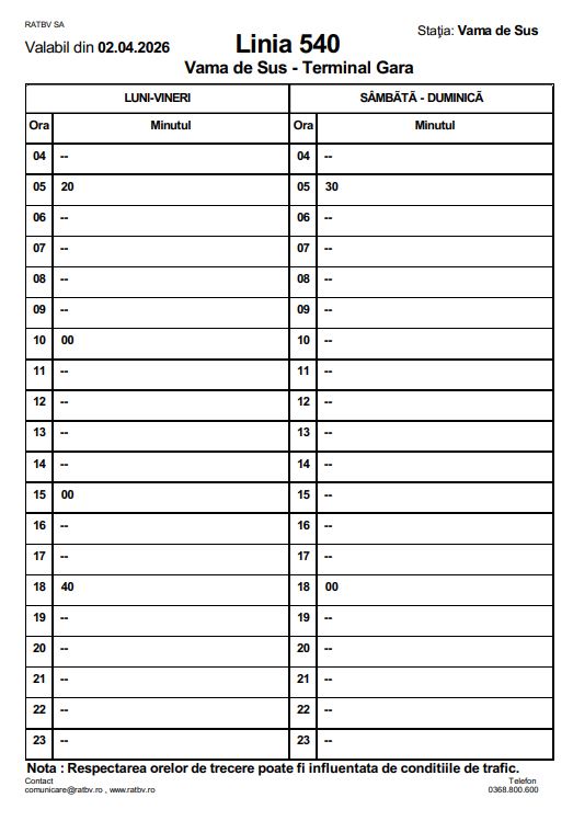 Pentru evitarea oricărei confuzii noul orar de circulație al liniei 540 va fi afișat pe site-ul www.ratbv.ro, în secțiunea ”Trasee și orare”, precum și în toate stațiile de pe traseu.