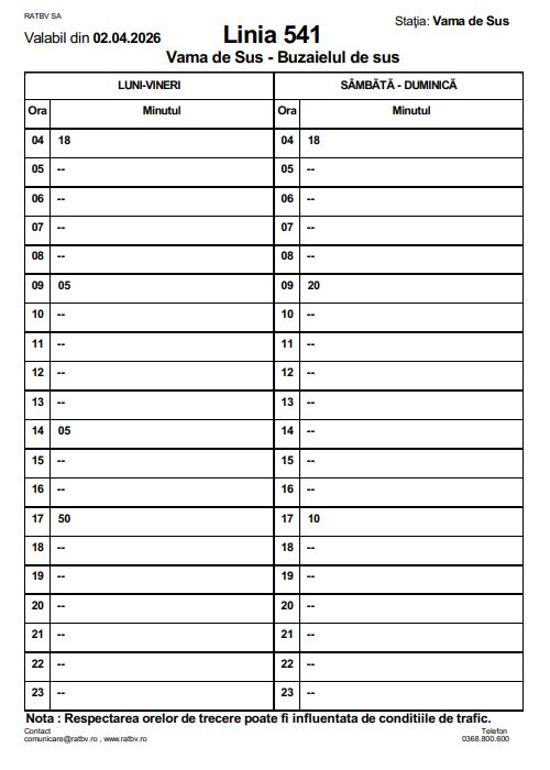 Tariful aplicabil pentru linia 541 este de 6 lei pentru un pachet 2 călătorii PERIURBAN Vama Buzăului, cu o valabilitate de 60 de minute/călătorie. Orarul de circulație al noii linii va fi afișat pe site-ul www.ratbv.ro, în secțiunea „Trasee și orare”, precum și în toate stațiile de pe traseu.
