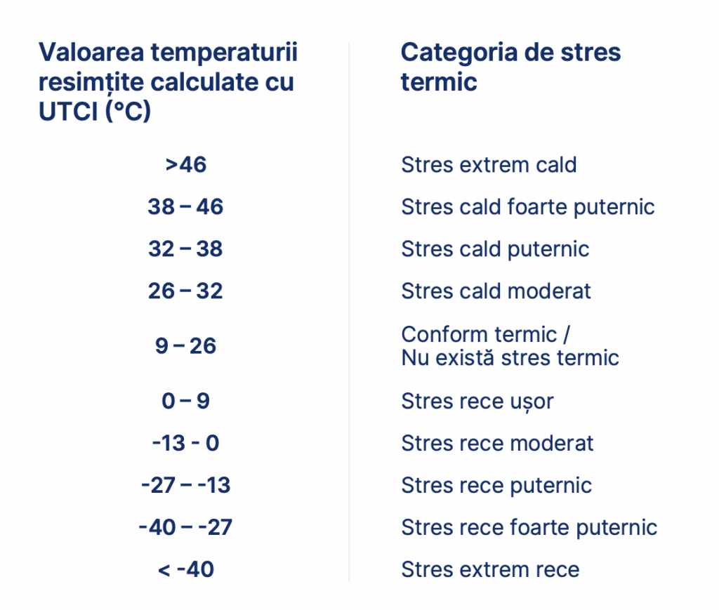 Pentru a măsura cu adevărat cât de confortabile sau stresante sunt anumite condiţii de vreme pentru corpul uman, se folosesc indici speciali, numiţi indici biometeorologici, precum temperatura fiziologică echivalentă (PET), indicele de temperatură-umezeală (THI) sau temperatura efectivă (TE) care iau în calcul acţiunea combinată şi concomitentă a tuturor acestor elemente. Cel mai modern dintre acești indici este indicele universal de confort termic (Universal Thermal Comfort Index, UTCI) care dă informaţii despre cum se simte cu adevărat organismul nostru în diverse condiţii de vreme, respectiv care este senzaţia termică resimţită, în funcţie de parametrii meteorologici, îmbrăcăminte şi nivelul de activitate fizică. Acesta se măsoară în °C şi există 10 clase de senzaţii termice, de la stres termic extrem cald la stres termic extrem rece (Tabelul 1).