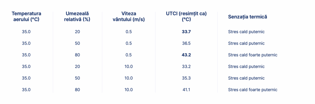 Câteva exemple concrete cu privire la modul în care este resimţită temperatura aerului de 35 °C, în diferite condiţii de umezeală şi de vânt, sunt prezentate în Tabelul 2. Astfel, se observă că pentru aceeaşi temperatură, masurată obiectiv, de 35 °C, variaţia temperaturii resimţite este de 10 °C, respectiv între 33.2 °C şi 43.3 °C.