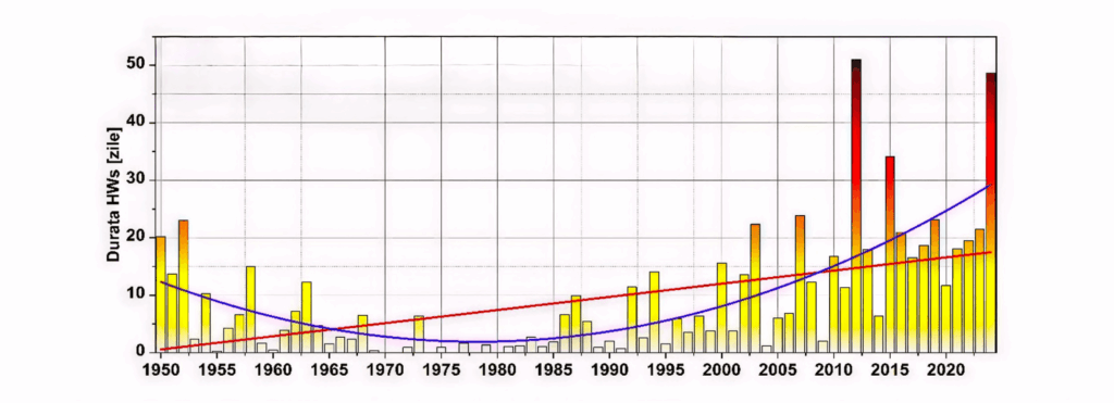 Dacă urmărim evoluția valurilor de căldură vom observa că în medie, în perioada 1950-2020, durata cumulată a valurilor de căldură a crescut considerabil (Fig. 3). Proiecțiile pentru viitor oferite de modelele climatice (Fig. 4), indică o creștere îngrijorătoare a duratei cumulate a valurilor de căldură în România.