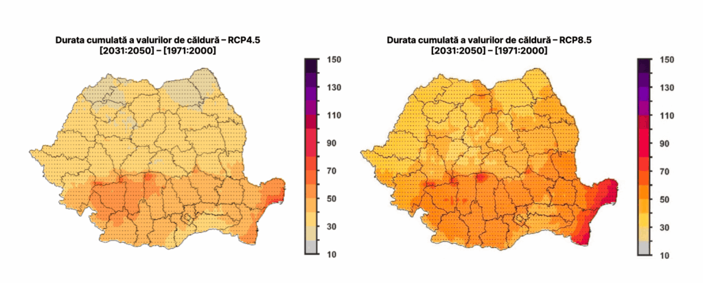 Figura 4. Evoluția valurilor de căldură în scenariul moderat (stânga) și pesimist (dreapta) de emisii pentru perioada 2031-2050. Conform raportului Starea Climei – România 2024