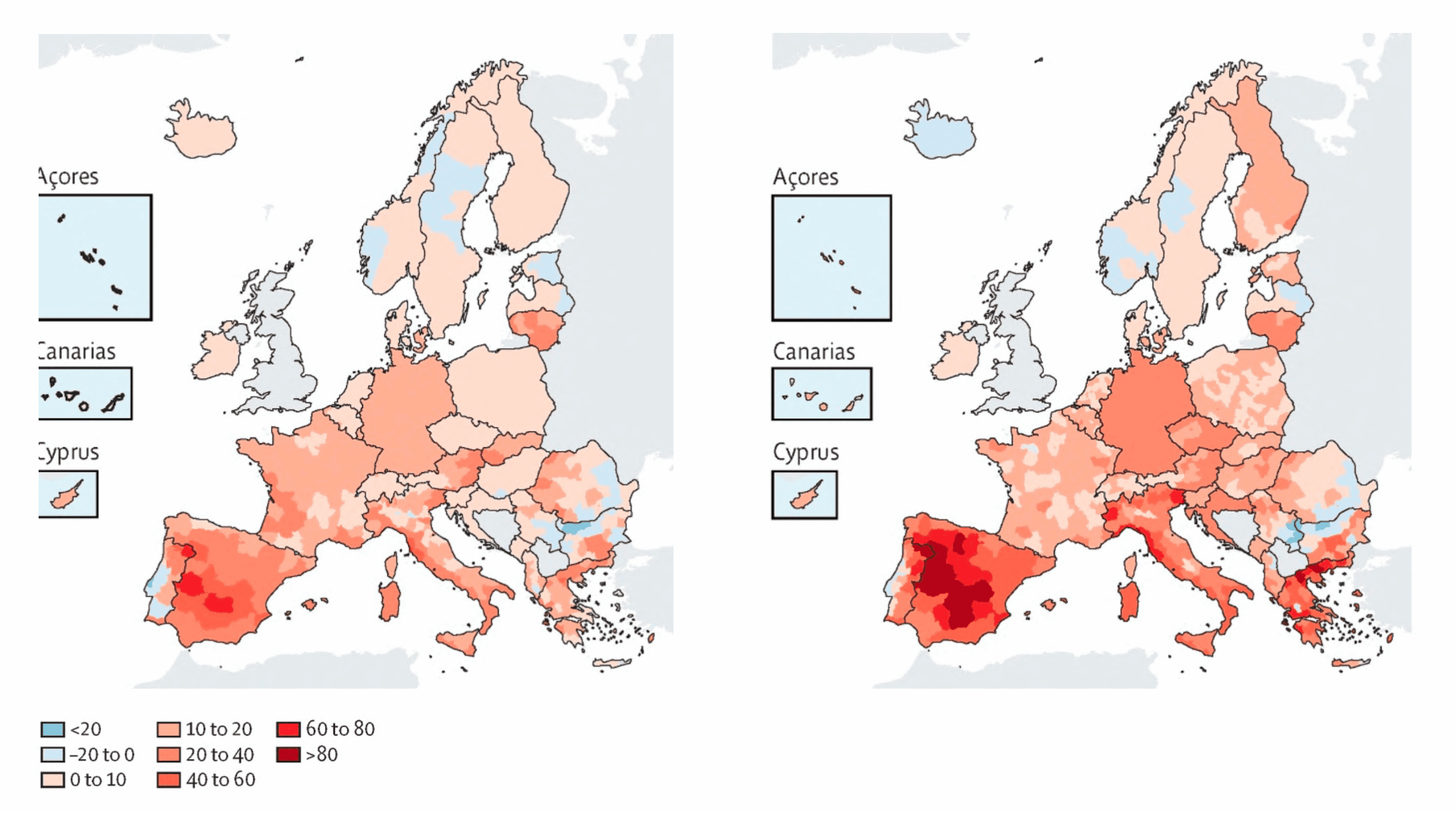Fig. 1. Schimbarea ratei mortalității cauzate de căldură, exprimată ca număr de decese la 100.000 de locuitori, între 2003–2012 și 2013–2022 pentru bărbați (stânga), și pentru femei (dreapta). Sursa: van Daalen K.R. et al, 2024