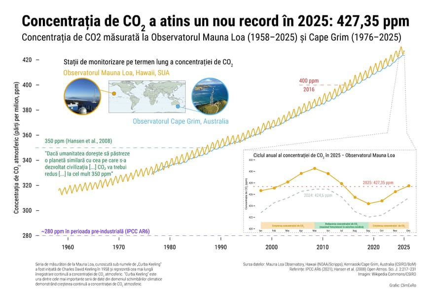 În 2025, concentrația de dioxid de carbon din atmosferă a atins un nou record: 427,35 părți per milion (ppm). Pentru a înțelege ce înseamnă această cifră, trebuie să ne întoarcem în timp. Înainte de Revoluția Industrială, când oamenii nu ardeau combustibili fosili în cantități mari și astfel nivelul de CO₂ era de aproximativ 280 ppm. Astăzi, am depășit cu mult acest nivel și continuăm să creștem concentrația de CO₂.