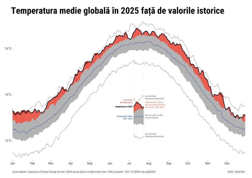 Acest grafic ne permite să vedem cum a evoluat temperatura medie globală în 2025. Linia roșie reprezintă temperatura din 2025, în timp ce zona gri arată întreaga gamă de temperaturi observate în ultimii 85 de ani (1940-2025). Linia albastră din mijloc este media pentru 1991-2020 și reprezintă valorile de referință (condițiile normale). Ceea ce vedem este că temperatura anului 2025 a fost aproape tot timpul în partea superioară sau chiar deasupra zonei gri, adică mai caldă decât 90% din toate valorile istorice.