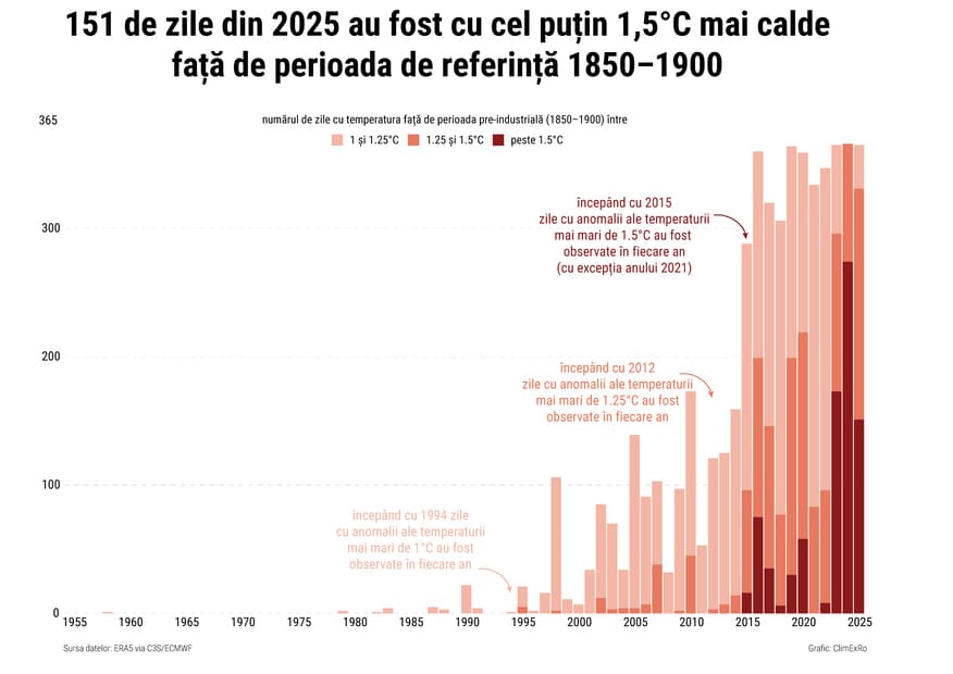 Unul dintre cele mai îngrijorătoare grafice este cel care arată câte zile pe an depășesc pragul de 1,5°C față de perioada pre-industrială. În anii 1980 și 1990, astfel de zile erau rare. Apoi, începând cu 1994, în fiecare an au existat zile cu temperaturi ce depășeau cu 1°C față de perioada pre-industrială. Din 2012, vedem în fiecare an zile care depășesc cu 1,25°C. Iar din 2015 în fiecare an (cu excepția anului 2021) au existat zile care au depășit pragul de 1,5°C. În 2025, peste 150 de zile au depășit pragul de 1,5°C. Aceasta înseamnă că aproape jumătate din an a fost peste ținta stabilită de Acordul de la Paris.