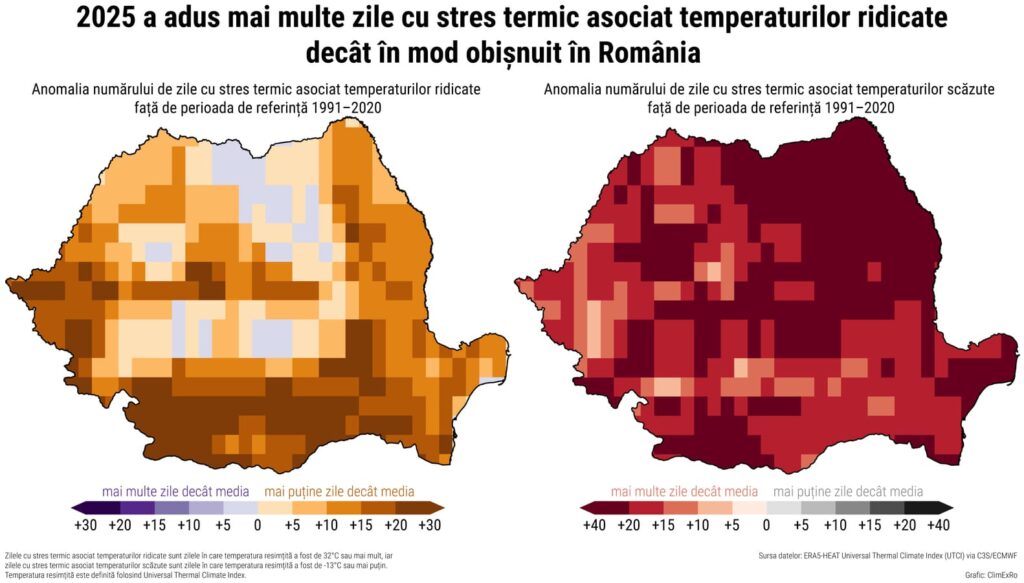 Ultimul grafic ne prezintă impactul pentru România. Hărțile arată anomalia zilelor cu stres termic, adică a zilelor când temperatura resimțită (care ia în calcul și umiditatea, vântul și radiația solară) ajunge la niveluri periculoase pentru sănătatea umană. În 2025, România a avut mult mai multe zile cu stres termic asociat căldurii extreme decât în mod obișnuit, în unele zone cu peste 20-30 de zile în plus față de media 1991-2020.