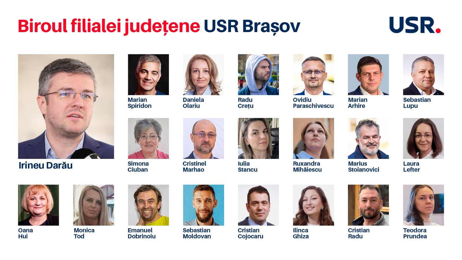 Biroul județean al USR Brașov este compus din președinte, 5 vicepreședinți și alți 15 membri: