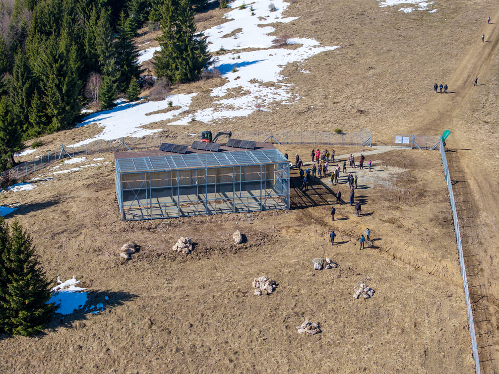 Voliera are aproximativ 160 de metri pătrați și o înălțime de 6 metri, fiind realizată din structură metalică, plasă din sârmă și o zonă de protecție din lemn împotriva intemperiilor. Întreaga structură este fixată pe 44 de șuruburi de fundație, care asigură stabilitatea construcției în condiții montane, iar zona este monitorizată video.